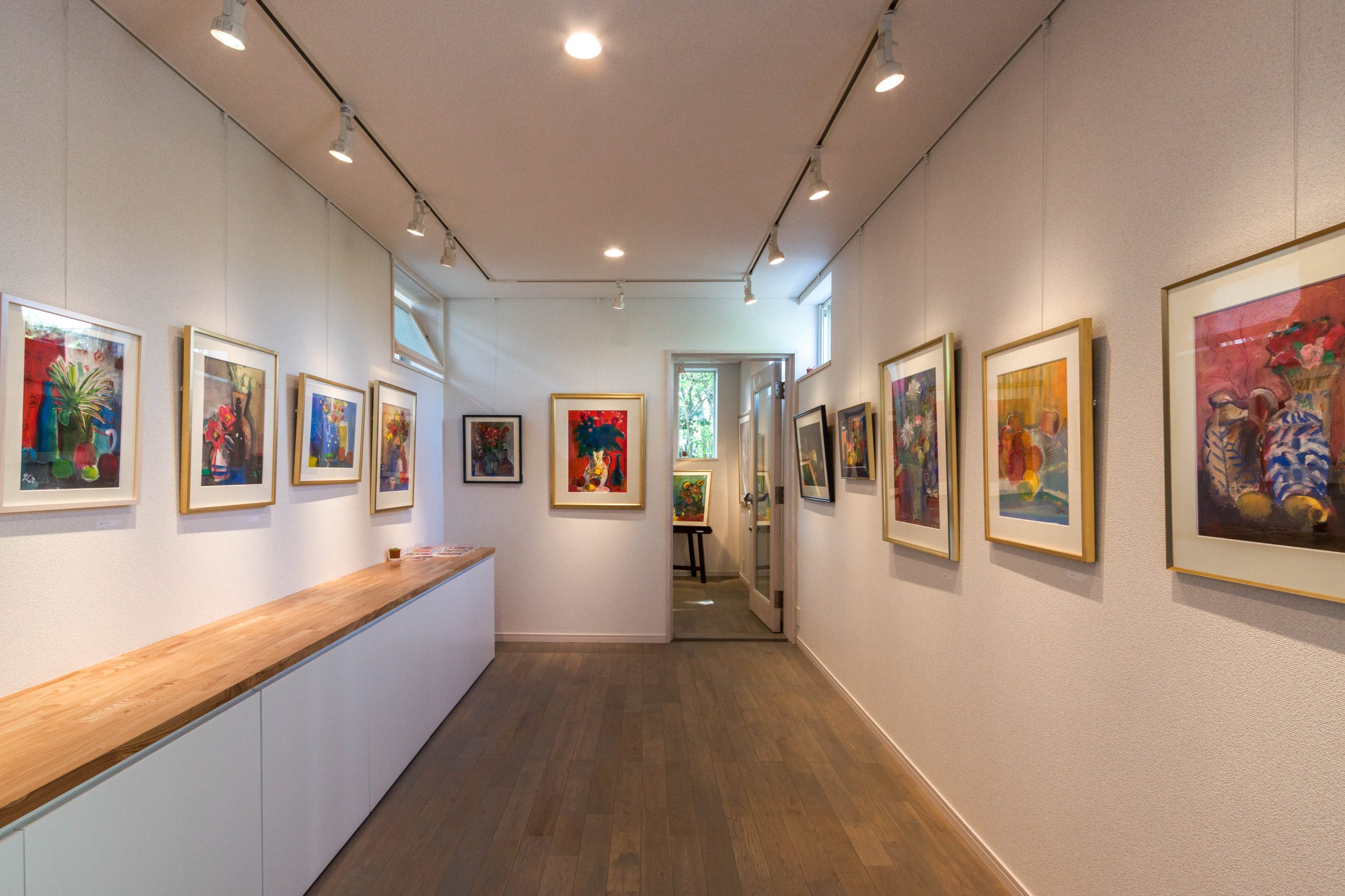 お二人暮らしのK様ご夫妻の家には、絵がご趣味の奥様のアトリエ兼レンタルギャラリーが併設されています。ギャラリーは北鎌倉駅から素敵な住宅街を抜けて続く曲がりくねった小路沿いに面して設けられ、専用の出入り口からアクセス可能です。斜面に半分埋め込まれたギャラリー兼アトリエはハイサイド窓からの安定した光と南北に抜ける風通しにより爽やかで落ち着いた空間になっています。貸しギャラリーとして使用する時は住居部分と完全に独立して使用できるよう小さな水周り空間がギャラリーの一画に設けられています。またオーナー在宅時は南側のサンルーム~中庭もギャラリーの延長として多目的に利用することができます。