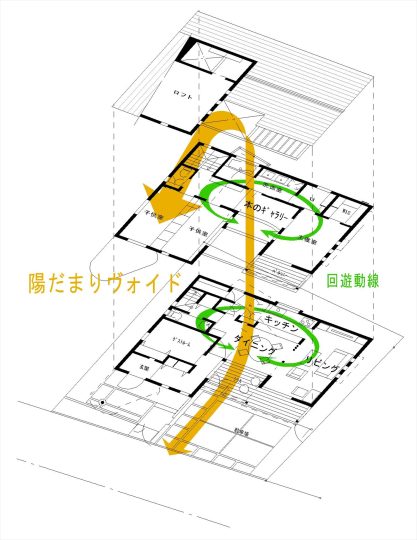 本が大好きな家族のために本のギャラリーを2階の吹き抜けに面して設けました。1階は吹き抜けの下に置かれた丸いダイニングテーブルを中心とした回遊動線のプランとしています。湘南・鵠沼の穏やかな気候を活かして、屋内と屋外のテラスが連続した、光と風につつまれた開放的な住まいです。内装はお施主様のこだわりの家具に合わせたチェリー色の木目を基調とした温かみのある色調でコーディネートされています。周辺の美しい街並みに調和するように、外観は天然木(不燃加工)をふんだんに使ったナチュラルなたたずまいとしました。