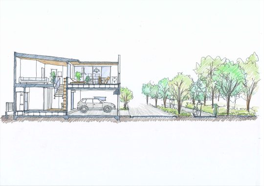 研究学園都市を南北に貫く基幹遊歩道沿いに立地するS邸の対面には「つくば宇宙センター」の緑豊かな広大な敷地が広がっています。