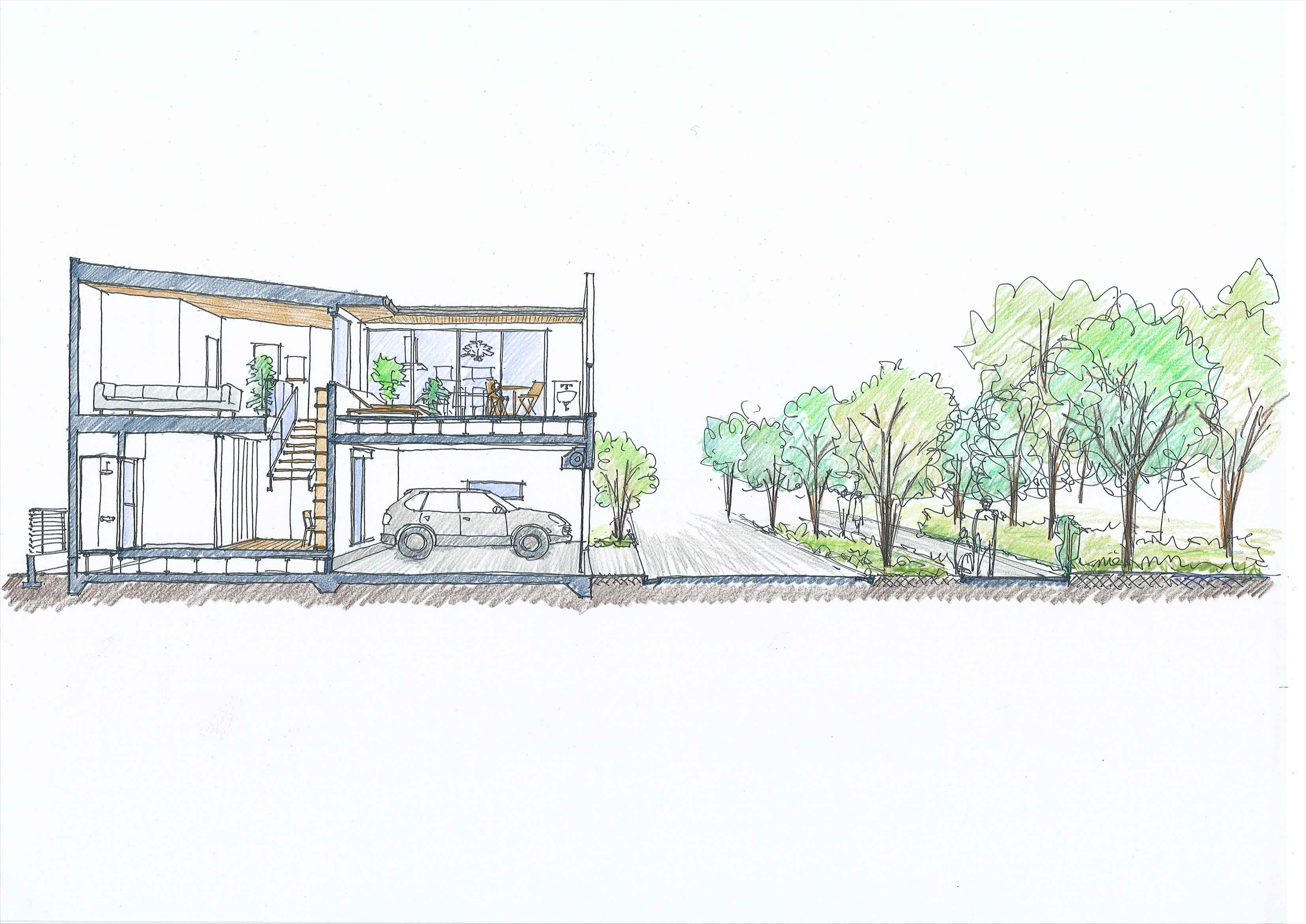 1階のビルトインガレージは2台駐車+αの広さがありDIYなどの作業スペースとしても活用できます。ガレージからはシューズクローゼットにアクセスすることができ、買い物の荷物などを運びこむ生活動線として利用できます。子供部屋の南にはウッドデッキテラスを設けてあり、大きな袖壁によって表通りからの視線を遮ったプライバシー性の高い屋外空間となっています。