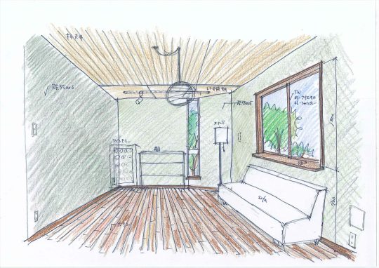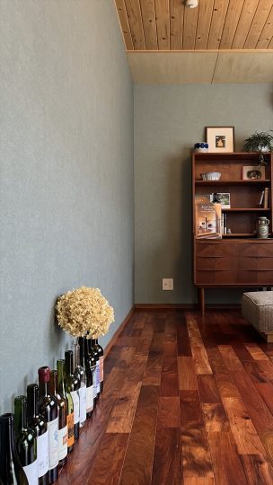 掃き出しだった窓を、外からの視線が気にならないように腰窓に改修し、カリンのフローリングやブルーグレーの壁紙など落ち着きのある質感や色調によって、親密な籠り感を演出しました。一方、天井や照明などは和室の時のものをそのまま残すなど、時や思い出の継承にも配慮しました。